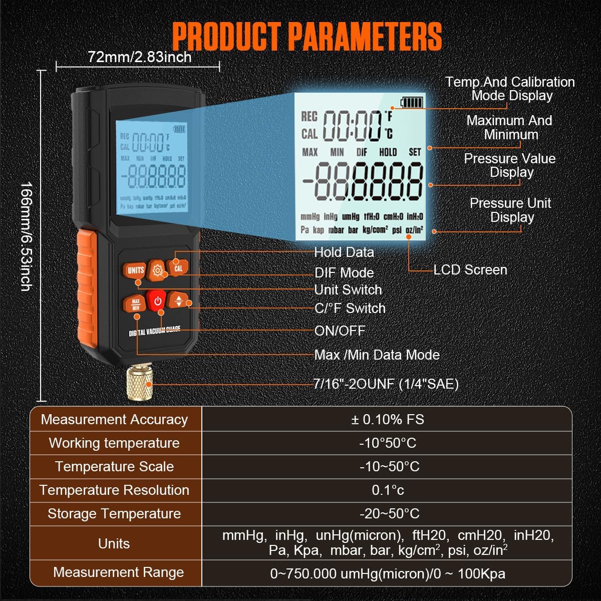 The Digital Vacuum Gauge is a high-quality and reliable tool for HVAC and automotive professionals. Its accuracy, versatile features, and alarm system make it an invaluable asset in diagnosing, troubleshooting, and maintaining systems.